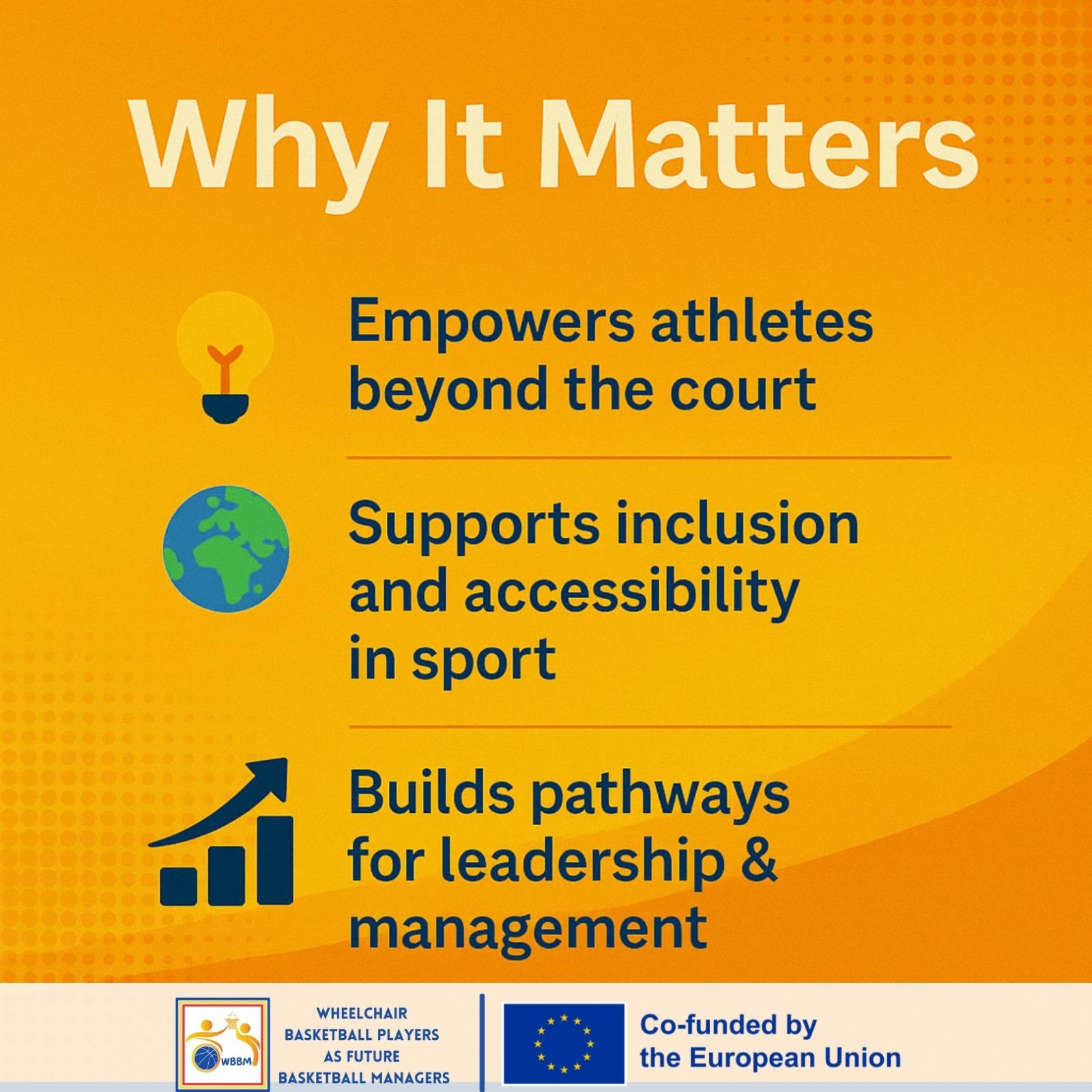 Proiectul este co-finanțat de Uniunea Europeană și promovează incluziunea, educația și dezvoltarea durabilă în sport, oferind sportivilor cu dizabilități oportunități concrete de implicare activă în viața administrativă a baschetului, după încheierea carierei competiționale.